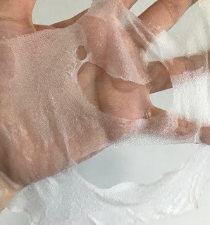 The firming mask has a minty scent with a subtle cooling sensation that reminds me of a mixture of eucalyptus and menthol notes which is calming and soothing. Made of 100% natural silk, the sheet mask is very thin and sheer to provide a good adherence to skin.